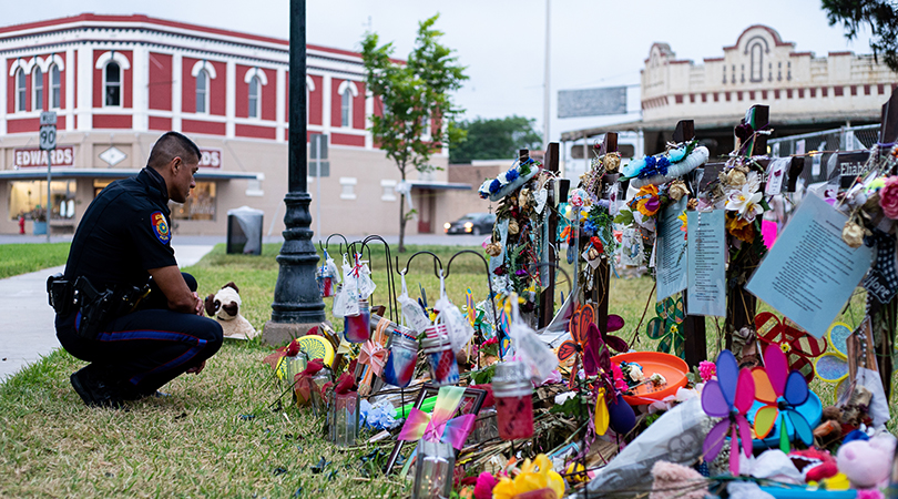 Cover image: A police officer from Edinburg, Texas, visits the memorial for Robb Elementary School victims in Uvalde, Texas, on June 9, 2022.