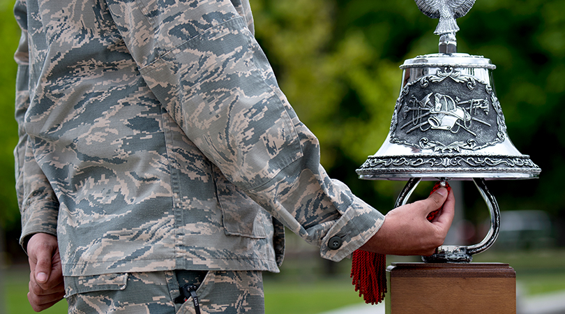 U.S. Air Force Airman 1st Class Ponce Francisco, 92nd Security Forces Squadron installation entry controller, rings a bell in remembrance of fallen law enforcement officers during a National Police Week Memorial Retreat Ceremony at Fairchild Air Force Base in Spokane County, Washington, on May 15, 2019. Courtesy: Airman 1st Class Whitney Laine, U.S. Air Force.*